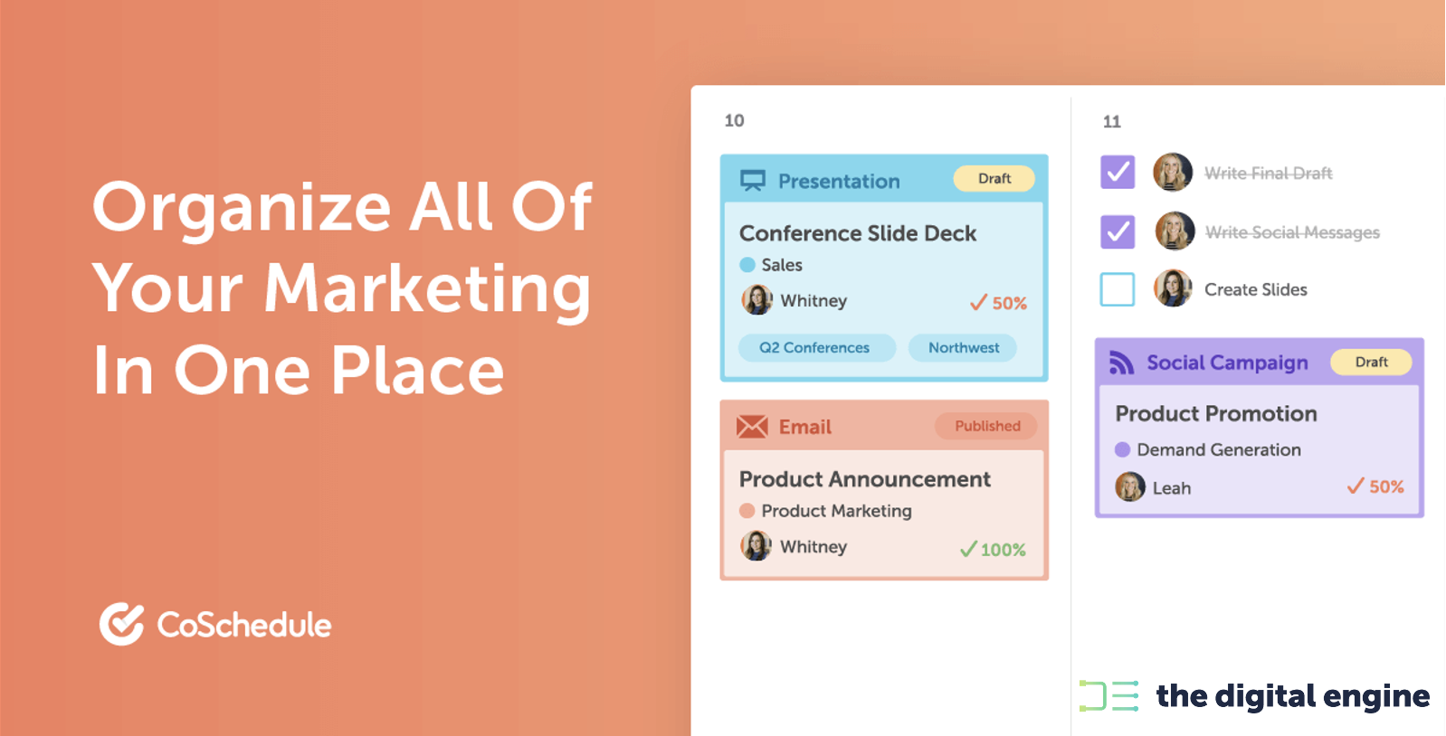 This week we also introduce the WordPress compatible marketing scheduling tool called CoSchedule. CoSchedule is an all-in-one marketing calendar for content, social, and email posting. As with all third-party products here at The Digital Engine, we introduce the students to a free version of the tool so that they can learn to use it effectively at no cost to them. The current free version of CoSchedule allows students to connect two of their social media platforms to their marketing tool. Once the connections have been made through the setup process, students can then create social posts right from their blog creation screen. It is a very handy tool that allows students to create and post almost all of their inbound content and social media strategy on the same screen. CoSchedule uses a monthly calendar to demonstrate when blog, social and even email posts are scheduled and allows students to see a 3000-foot-view of their inbound marketing campaign, all from the same calendar. It is a very good complement to our editorial calendar process created through Excel earlier in the semester. Using CoSchedule allows students to gain valuable experience with a very popular calendar tool, which if they go on to work in the digital marketing industry, will be a valuable skill set learned.